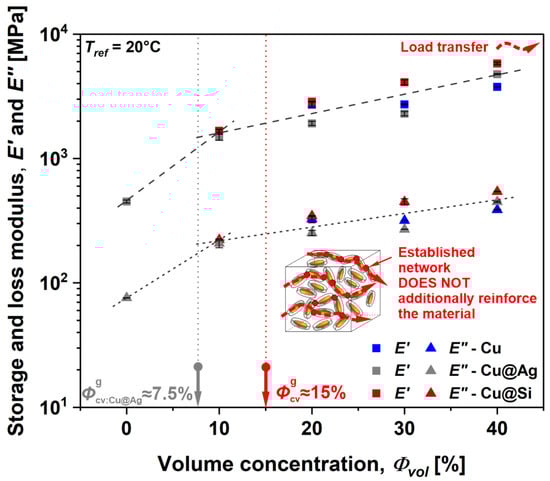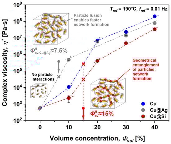 The network formation of the investigated composites was determined by observing η* in the terminal region, here selected at 0.01 Hz, as a function of volume concentrations Φvol (Figure 4). Results show a sigmoidal-shaped curve or S-curve in which the network formation was identified at an inflection point, representing the critical volume concentration at which Cu flakes geometrically entangle, which is also known as the geometrical percolation point, Φcv,g [34]. Below Φcv,g, particles rotate freely about their center mass, mainly acting on the matrix material. However, above Φcv,g particles form a randomly connected network and exhibit long-range interactions, which profoundly affect the viscoelastic material response and functionality. Based on the analysis, Φcv,g was for the uncoated Cu and silica-coated Cu@Si composites determined to be ~15%, which is also within the usual value range reported in the literature for this particle geometry [35]. Surprisingly, the silver-coated Cu@Ag composites exhibited a much lower Φcv,g, i.e., ~7.5%. Since Φcv,g is directly related to particle geometry, this decrease may be explained by an increasing particle aspect ratio Ar, here related to the fusion of flakes, resulting from the thermo-chemical reaction of the Ag coating material [36,37]. These results could be extremely beneficial when evaluating the electrical functionality of Cu@Ag composites as the network is formed at lower Φvol, while also exhibiting more pathways for electron transfer compared to the other investigated materials. However, once the network was established, all investigated composites exhibited similar viscoelastic responses, indicating that copper flakes display main load transfer capabilities regardless of their surface modification.