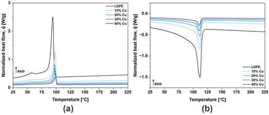 When investigating conductive polymer composites, thermal analysis is commonly used as it enables insight into morphological (structural) changes of the matrix material, driven by particle interactions (network formation), as well as thermo-chemical or other reactions of the filler materials [38,39]. Those changes are usually determined by observing the crystallization and melting kinetics during cooling and 2nd heating, through so-called thermograms. For convenience, only thermograms for composites with uncoated Cu flakes are presented in Figure 5, however, the same trends were observed for the other two investigated materials, i.e., Cu@Ag and Cu@Si. The results show that the addition of Cu flakes affects the crystallization and melting kinetics, shifting peaks while reducing the thermal response, i.e., exo- and endothermic reactions, which will be subsequently addressed in more detail.