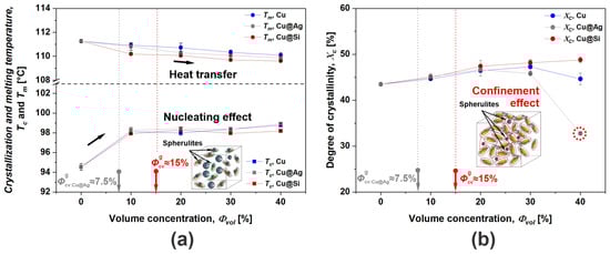 Figure 6. (a) Melting and crystallization temperatures and (b) degree of crystallinity as a function of volume concentration for the composites with and without surface modification of Cu flakes.