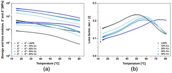 Dynamical mechanical analysis, DMA, is a common characterization technique for investigating the mechanical response of polymers and polymer-based composites [43]. Since DMA is highly sensitive to polymer relaxation dynamics, phase transitions, morphology and other structural changes, it also offers the principal outlook on the mechanics of particle interactions as well as interfacial and other mechanisms (network formation, adhesion, etc.) when dealing with composites. The above-mentioned influences can be observed through the viscoelastic properties, i.e., storage modulus (E′) and loss modulus (E″). For convenience, only the viscoelastic properties for uncoated Cu composites are presented in Figure 7, which include the damping ratio tan δ, where phase shift δ represents the ratio of a material’s viscous contribution E″ to the elastic response E′. The same behavior was also observed for the composites with Cu@Ag and Cu@Si flakes.