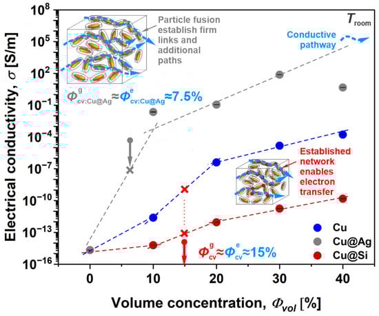 Nevertheless, the obtained results primarily indicate that geometrical entanglement is crucial for the establishment of conductive pathways within such composites, i.e., Φcv,g = Φcv,e, as flakes do not inherit a particular alignment. Moreover, they also confirm the fusion of Cu@Ag flakes as a result of the thermo-chemical reaction of the Ag coating material [50], which was also observed through rheological and thermal analyses.