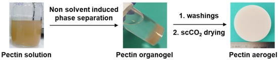 Pectin aerogels were prepared via the dissolution of pectin in water followed by the non-solvent-induced phase separation approach [20,21]. Pectin concentrations in the starting solution were 2 and 3 wt%, and pH values were adjusted to 2 and 3 by the addition of a small quantity of HCl or KOH, respectively. The following formulations 2 wt%/pH 2; 2 wt%/pH 3; 3 wt%/pH 2 and 3 wt%/pH 3 were prepared and will be noted (X, Y) with X corresponding to pectin concentration and Y corresponding to solution pH. The pectin solution was then poured into molds of 27.5 mm diameter, and the solvent-to-non-solvent exchange was performed. Two pectin non-solvents were used: ethanol (E) and acetone (A) [20]. Solvent/non-solvent exchange was performed progressively with the water/non-solvent ratio (v/v) decreasing to 50/50, 25/75, and 0/100, which was followed by a final extensive washing with pure non-solvent. This procedure led to a fully coagulated pectin network forming a monolithic and self-standing organogel (Figure 1).