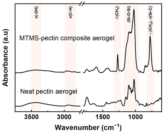 ATR-FTIR spectra of neat pectin aerogel and MTMS–pectin composite aerogel obtained after 24 h reaction. The characteristic bands of the deposited silica-based polymer are marked on the spectra.