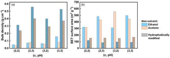 The properties of composite aerogels obtained after 24 h reaction are summarized in Figure 4, and the values are provided in Table S2. After 24 h reaction, a significant amount of mass increase (around 150–200 wt%) occurred for all materials, and a volumetric shrinkage was observed (Table S1). The volumetric shrinkage during the reaction was higher for the aerogels prepared with ethanol as non-solvent (35–46%) compared to that in acetone (18–28%). All composite aerogels showed higher density values in comparison with the neat pectin aerogels (Figure 4a), which is in accordance with the mass increase and volumetric shrinkage. The lowest density was obtained for the composite aerogels prepared from solutions of pectin concentration 2 wt% and pH 2 and non-solvent acetone, i.e., (2, 2, A) formulation. It is noted that this formulation possessed the lowest density for the neat pectin aerogels as well. Densification of the network during modification resulted in lower values of BET surface area for all modified aerogels (Figure 4b) with the lowest values for composite aerogels prepared with ethanol as non-solvent (87–129 m2 g−1) and the highest values, very close to each other, for the composite aerogels prepared with acetone as non-solvent (152–169 m2 g−1).