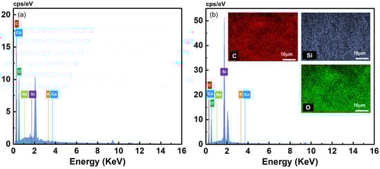 The composition of the neat and composite pectin aerogels was analyzed using EDX spectroscopy (Figure 6 and Table 2). This method provides elements’ mapping and concentration in a selected area. EDX analysis of neat pectin aerogels (Figure 6a, Table 2) revealed, as expected for a carbohydrate, a high content of carbon and oxygen atoms, with their proportion in agreement with data from the literature [66], and with a negligible concentration of silicon. After the modification with MTMS for 24 h, the mass percentage of silicon increased to 24% in the mapped area (Figure 6b, Table 2). For this formulation, (2, 2, A), the mass increase during the reaction was 154%, as shown in Table S2. The distribution of carbon, oxygen and silicon on the selected inner surface of the composite aerogel shows a homogeneous distribution of all elements and, in particular, of the silica-based polymer (Figure 5). EDX results confirmed that MTMS diffused inside the pectin network and was deposited on the aerogel pore walls.