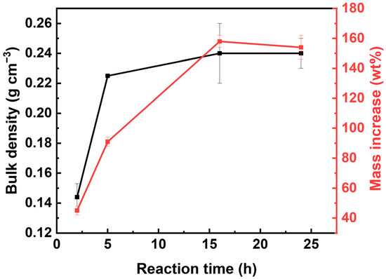 The evidence of pectin hydrophobization, for all reaction times used, is confirmed by ATR-FTIR spectroscopy (Figure S2). Two hours was sufficient time for the reaction to occur. The intensity of the broad band at 3400 cm−1 (Figure S2), assigned to the stretching vibrations of –OH groups of the pectin chain and water molecules (see also Figure 3), decreased with the increase in CVD time due to the interactions of pectin with the silica-based polymer and the reduction in water content inside the composite materials’ matrix after hydrophobization. The evolution of the composite aerogel properties as a function of reaction time is presented in Figure 8 for the formulation (2, 2, A) and summarized in Table S2 for other formulations. MTMS deposition resulted in a progressive increase in density, reaching a plateau value after 16 h of reaction (Figure 8). The reason for the density increase is a significant increase in sample mass, up to 150–160% (Figure 8 and Table S2); the volumetric shrinkage during reaction was not very high: within 30–40% (Table S2). The reaction time should be as short as possibles to avoid a too high increase in the final aerogels’ bulk density. The BET surface area of the composite aerogels was lower than that of the neat pectin aerogels prepared in the same conditions and was in the range of 120–172 m2 g−1 (Table S1).