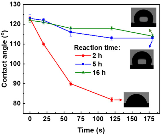 Water contact angles as a function of time for composite pectin aerogels (formulation 2, 2, A) for 2 h, 5 h, and 16 h reaction time.