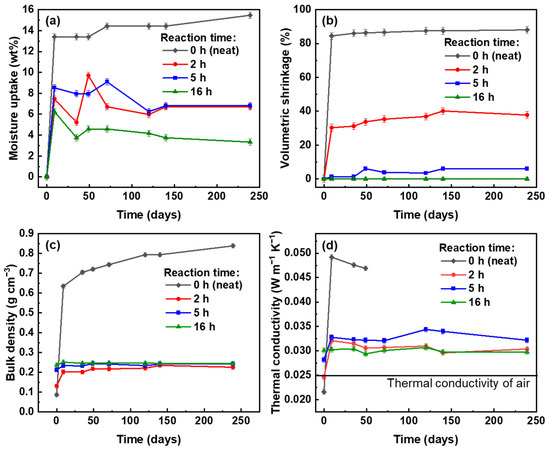 (a) Moisture uptake, (b) volumetric shrinkage, (c) bulk density, and (d) thermal conductivity as a function of residence time in the climatic chamber for neat pectin aerogels (formulation (2, 2, A) and the corresponding composite aerogels made after 2 h, 5 h, or 16 h MTMS deposition.
