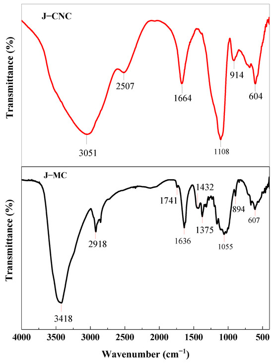 FTIR spectrum of micro-cellulose and extracted nanocellulose are shown in Figure 5. There are two primary absorption regions observed at the highest wave number (3418–3051 cm−1) and at the lowest wave number (1741–604 cm−1). In the J–MC and J–CNC samples, the OH bending vibration of the water absorbed was linked to the peaks in the FTIR spectrum represented at 1636 and 1664 cm−1, respectively. The peaks in the 3418 cm−1 region of the J–MC sample are a result of α-cellulose’s O–H stretching, which has strong intra- and intermolecular H bonding [51]. J–MC also displayed the typical peaks at 2918 cm−1 due to the cellulose’s C–H stretching vibration. The acetyl group in the cellulose’s amorphous area caused the formation of a transmittance small peak at 1741 cm−1, which vanished after acid hydrolysis [52]. In support of cellulose’s presence, the peaks at 1432 cm−1 were caused by CH2 bending in symmetry, at 1375 cm−1 by –CH bending, and 1055 cm−1 by C–O stretching vibration in the J–MC sample [53,54]. The peak appearing at 607 cm−1 for J–MC was due to OH cellulose that has bent out of plane [10].