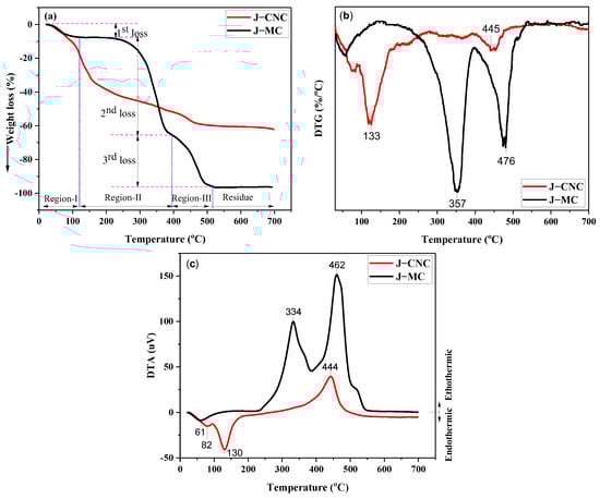TGA, DTG, and DTA curves of the J–MC and J–CNC samples, respectively (a–c).