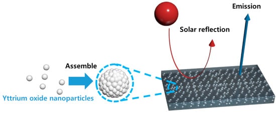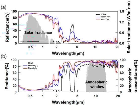 Yttrium oxide (Y2O3) has been employed to achieve superior PRC efficiency. The refractive index of this material differs from that of its matrix, closely matching the emissivity of silica in the atmospheric window, and it is chemically stable. Utilizing hollow particles to construct a material structure increases the number and surface area of its reflective interfaces, enabling effective solar reflection [,]. In previous research, polydimethylsiloxane (PDMS) was chosen as the matrix for PRC films due to the electromagnetic radiation caused by bonding vibrations within its atmospheric window. PDMS, an inorganic polymer, features a Si-O-Si bond—pivotal in radiative cooling studies on emitting electromagnetic waves in the atmospheric window []. Among the fillers that excel in terms of their radiative cooling effects, silica, which possesses a Si-O-Si bond akin to PDMS, offers high-atmospheric-window emissivity and solar reflectance []. However, blending silica with PDMS could result in similar refractive indices because of their similar elemental contents, potentially lowering their solar reflectance. Therefore, Y2O3 was selected as an alternative due to its favorable atmospheric window emissivity and high solar reflectance [].