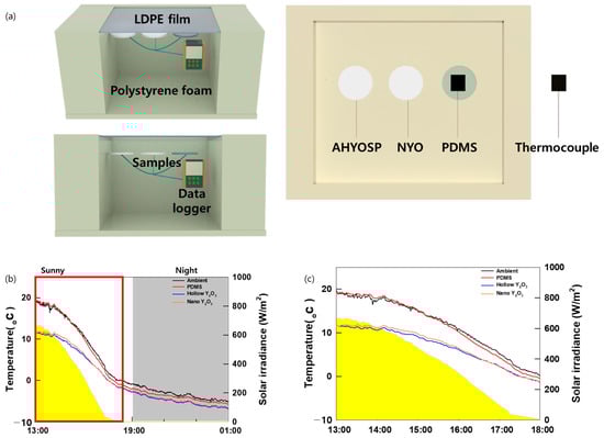 This section empirically validates the cooling performance of the developed PRC films through field experiments. Figure 5a shows a schematic of the experimental setup used for data acquisition. Figure 5b shows the temperature variations within the samples, which correspond to the concurrent solar radiation data; a lower value indicates a more efficient cooling process. The close alignment of the solar radiation trends with the temperature fluctuations observed in the measured PRC films was noteworthy, proving that no external factors have influenced our observations and thereby confirming that the results are directly attributable to the effects of solar radiation. The shaded areas in the graph represent periods of reduced solar radiation at night. As shown in Figure 5c, the AHYOSPs consistently exhibited the lowest temperature during daylight. This thermal hierarchy directly corresponds to the solar reflectance characteristics of the materials and is primarily driven by their individual solar reflectance values. Importantly, the structural attributes of the particles also play a pivotal role in shaping the variations in solar reflection. The nocturnal trends differed from the daytime patterns, with a narrowing gap observed in cooling efficiency during the day, indicating that, as solar radiation decreases, emissivity contributes more dominantly to cooling than reflectance, with the temperatures of the ASYOSPs and NYO becoming almost identical as the night approaches. During the day, uncontrolled nano yttrium oxide showed approximately a 1 °C improvement in cooling efficiency and a 7 °C improvement in cooling efficiency compared to the PDMS baseline. Our PRC film performance enhancement demonstrates that there is potential to achieve improved cooling efficiency through particle control in PRC research.