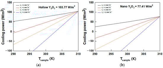 The theoretical net cooling power of the PRC film was estimated using MATLAB-based calculations to quantitatively investigate its cooling performance. To calculate its theoretical cooling capacity, we used Equations (1)–(6) and applied arbitrary heat transfer coefficient (hc) values ranging from 0 to 12 W·m−2·K−1, as depicted in Figure 6. In this calculation, the ambient temperature was set to 300 K, consistent with the field test temperature measurements. As shown in Figure 6, the cooling capacity of the AHYOSPs reached 103.77 W/m2, whereas the highest capacity of NYO was 77.41 W/m2, consistent with the field test results, thus suggesting that the proposed strategy for assembling nanoparticles was successful.