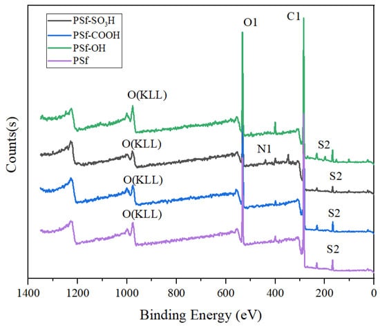 The elemental surface compositions of PSf, PSf-OH, PSf-COOH, and PSf-SO3H.