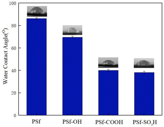 The static contact angle is a direct method of evaluating wettability and decreases with increasing hydrophilicity to indicate the hydrophilicity of the film surface. Figure 2 shows the contact angles of the membranes, the contact angles of PSf, PSf-OH, PSf-COOH, and PSf-SO3H membranes were 86.2°, 69.5°, 40.1°, and 38.2°, respectively, while the contact angles of PSf and PSf-SO3H membranes were significantly reduced to 86.2° to 38.2° after grafting -SO3. Therefore, it can be concluded that the hydrophilicity of PSf-OH, PSf-COOH, and PSf-SO3H modified film has been greatly improved.