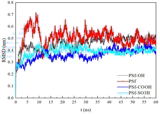 Figure 5 shows the BSA backbone RMSD during adsorption, that is, the change amplitude of BSA molecular configuration relative to the initial structure [22]. Root mean square deviation (RMSD) refers to the coordinate deviation of the atomic coordinates in the protein main chain molecule relative to the reference structure, which is fitted by the least square method. It is used to indicate that with the change of the simulated time protein configuration, the larger the RMSD value fluctuation range, indicating that the protein configuration is prone to change, and the larger the RMSD value, the higher the probability of protein mutation. The larger the protein mass adsorbed on the surface of the membrane, the larger the fluctuation range of the RMSD value of the protein. Through the experimental characterization, it was found that the protein adsorption amounts was the largest in the PSf system, and the protein adsorption amounts was the smallest in the PSf-SO3H system. The simulation showed that the RMSD value of proteins in PSf system had the largest fluctuation range, and the RMSD value of proteins in PSf-SO3H system had the smallest fluctuation range. The simulation results are in agreement with the experimental characterization.