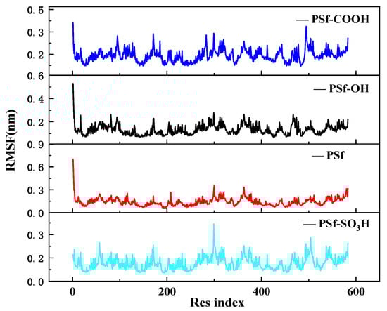 Figure 6 shows the RMSF of each residue in the final stage of BSA molecule simulation, representing the stability of each residue [23]. The RMSF of BSA residues in the PSf-OS3H system remains at a relatively stable and low level, indicating that the continuous electrostatic attraction on the surface of PSf-OS3H plays a role in fixing the configuration of BSA, thus maintaining relative stability of the adsorbed BSA peptide chain.