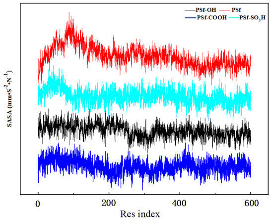 Figure 7 shows the simulated SASA of each residue in the final stage of BSA. Since the molecular structure of macromolecule BSA is flexible, the protein has been folded, and under the folding action, some residues are wrapped in other molecules and cannot directly contact with the membrane surface, so the SASA value of the residues wrapped in the interior is relatively low. Figure 7 simulated the SASA changes of BSA residues in PSf-CH3, PSf-OH, PSf-COOH, and PSf-SO3H membrane systems. In addition to the PSf-CH3 system, the residue SASA of BSA has a large range of changes, indicating that the BSA has a higher surface energy after contact with the PSf membrane. In the PSf-OH, PSf-COOH, and PSf-SO3H membrane systems, the surface of the membrane material is too small to cause protein folding, which further indicates that the smaller the surface energy of the membrane surface, the smaller the probability of irreversible folding and denaturation of the protein during the adsorption process with the membrane surface [24].
