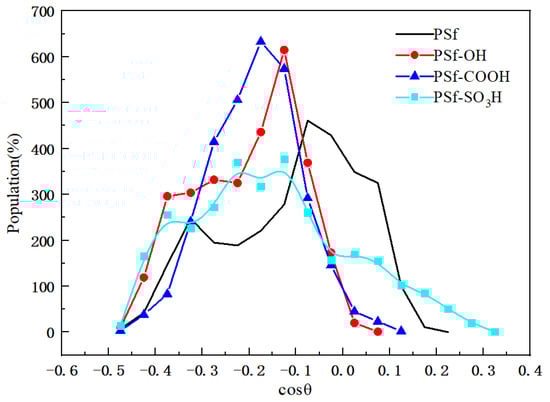 The adsorption orientation of proteins on the surface of materials determines the efficiency of their biological activity [24]. The orientation angle (θ) is defined as the angle between the dipole moment of the protein and the normal vector, as shown in Figure 8 for the adsorption orientation distribution curve of BSA at the stable stage. The cosine values corresponding to the peak distribution of BSA orientation in PSf, PSf-OH, PSf-COOH, and PSf-SO3H systems are all negative, approximately −0.60, −0.56, and −0.11, respectively, with corresponding orientation angles at 96°. In comparison to the PSf system, PSf-OH and PSf-COOH exhibit narrower peaks in their orientation distributions. This suggests that surface adsorption of BSA is subject to repulsive forces in these systems leading to relatively stable adsorption orientations under sustained repulsive forces.