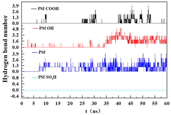 Hydrogen bonding is a polar force and has the function of anchoring protein molecules. Figure 10 shows the number of hydrogen bonds generated between the BSA and the membrane surface. The number of hydrogen bonds in PSf system is the largest, and due to the electrostatic attraction of the material interface, the contact area between BSA and the surface is larger. The bonds in PSf-COOH and PSf-OH systems are mainly from the local electrostatic attraction. The surface of PSf-SO3H did not form hydrogen bonds with BSA, and the number of hydrogen bonds was approximately 0. Due to the weak interaction between surface and protein, the contact area of BSA was small.