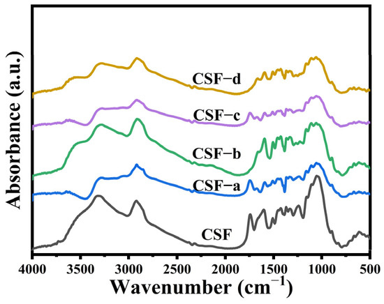 In the infrared spectra of CSFs, a prominent peak at 3318.98 cm−1 corresponding to the stretching vibration of hydroxyl groups (-OH) was observed. Additionally, a peak indicative of the presence of carbon–hydrogen bonds (C-H) was observed at 2921.61 cm−1. The peak detected at 1054.22 cm−1 corresponds to the vibration of C-O-C in cellulose and hemicellulose, indicating the presence of polysaccharide chains in CSFs [36]. Furthermore, the presence of benzene ring structures in CSFs led to characteristic peaks associated with aromatic rings in the range of 1241 to 1603 cm−1 [37]. The infrared peak corresponding to the hydroxyl groups (3318.98 cm−1) of CSFs treated with stearic acid (CSF-a) showed a reduction. This reduction is likely due to a chemical reaction between stearic acid and the hydroxyl groups on the CSFs, resulting in a decrease in the hydroxyl content on the fiber surface and the formation of ester bonds, thereby enhancing the infrared peak representing carbon–oxygen bonds (C=O) at 1748 cm−1. Additionally, the presence of stearic acid’s eighteen carbon alkane chain resulted in the encapsulation of the fiber surface, weakening the infrared peak associated with hydroxyl groups. The infrared spectrum of CSFs treated with alkali (CSF-b) reveals an enhancement in the infrared peak attributable to the stretching vibration of carbon–hydrogen bonds (2921.61 cm−1) and the hydroxyl groups represented at 3318.98 cm−1. This enhancement is attributable to the alkali treatment’s ability to remove pectin, polysaccharides, and other components from the surface of CSFs. Additionally, a decrease in the intensity of characteristic peaks related to aromatic groups observed between 1241 and 1603 cm−1, is noted. This decrease is attributable to the removal of lignin components by the alkali treatment, resulting in surface roughening and the exposure of a large number of cellulose carbon–hydrogen bonds and hydroxyl groups [38,39,40,41,42]. The treatment of CSFs with a silane coupling agent (KH550) (CSF-c) leads to a reduction in the intensity of the hydroxyl group peak at 3318.98 cm−1, attributable to the effect of the silane chain. Additionally, an enhancement in the peaks corresponding to the Si-O-C functional group is observed at 1054 cm−1 and 1105 cm−1. In comparison to CSFs treated solely with silane, those subjected to a combined treatment of alkali and silane (CSF-d) exhibit a strengthened hydroxyl peak at 3318.98 cm−1, albeit lower than that of alkali-treated fibers. Furthermore, a decrease in the peaks representing specific functional groups of lignin is noticed in the range of 1241 to 1603 cm−1. This phenomenon arises from the removal of lignin and pectin components due to alkali treatment, exposing a considerable number of hydroxyl groups. Subsequent silane treatment results in a reaction with these exposed hydroxyl groups, leading to a reduction in their peak intensity [43,44,45].