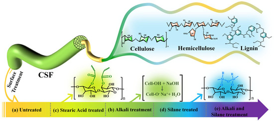 After undergoing chemical treatment, all samples of CSFs were subjected to a drying process in an oven at 80 °C for 24 h to eliminate any remaining moisture. Subsequently, the fibers were further dried in a vacuum drying oven for 4 h to facilitate the preparation of the composites. The quantitative analysis of the chemical composition of CSFs with various chemical treatments was conducted using the Van Soest method [31].