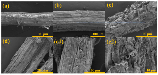 The reaction mechanism and morphological changes in CSFs with different chemical treatments are depicted in Figure 2. Scanning electron microscopy (SEM) was employed to conduct a microscopic morphological analysis of the treated CSFs, as illustrated in Figure 3. The untreated CSFs depicted in Figure 3a exhibit irregularities and gaps on the fiber surface, which can be attributed to the predominant cellulose-based fiber bundles forming the primary matrix of these fibers. These fiber bundles are held together by interfaces composed of pectin, hemicellulose, and lignin. Consequently, the presence of waxy layers and protrusions on the surface is clearly evident [46,47,48]. In Figure 3b, the image depicts CSFs that have been treated with stearic acid, resulting in a stearic acid coating on the surface of the fibers. This coating imparts smoothness to the surface and eliminates any impurities or protrusions present on the original surface of the CSFs. Figure 3c illustrates CSFs that have undergone alkali treatment, leading to the removal of components such as pectin, hemicellulose, and lignin from the fiber surface. Consequently, this process results in an increase in the roughness of the fiber surface, rendering it irregular and porous. Such a rough and porous surface facilitates enhanced adhesion between fibers and matrix materials by promoting mechanical interlocking between them [38,46,47,49]. The surface of CSFs treated with silane is depicted in Figure 3d. It can be observed that the application of a silane coupling agent induces significant alterations in both morphology and texture, resulting in a cleaner surface covered by a layer of silane coating. Additionally, the fiber surface exhibits uniformly distributed pores. This phenomenon can be attributed to the infiltration of the silane coupling agent into gaps on the cotton stalk fiber surface within an isopropanol/water mixture solvent, leading to the dissolution of impurities such as pectin under the influence of isopropanol. Subsequently, a hydrolysis reaction occurs when the silane coupling agent comes into contact with water, causing trimethoxy groups to hydrolyze into hydroxyl groups and form γ-aminopropyl dimethoxysilanol. Through condensation reactions between hydroxyl groups present on both the silane coupling agent and cotton stalk fiber surface, silicon–oxygen bonds and carbon–oxygen bonds are formed, ultimately resulting in the formation of a distinct silane coating on the cotton stalk’s surface while simultaneously altering its morphology [44,49]. The surface morphology of CSFs subjected to alkali/silane treatment is depicted in Figure 3(e1,e2). Initially, the fibers undergo alkali treatment, resulting in the removal of components such as pectin, hemicellulose, and lignin from the fiber surface. This leads to an increase in surface roughness and a proliferation of hydroxyl groups. Consequently, the fiber surface becomes irregular and porous, with numerous exposed hydroxyl groups. Subsequent silane treatment on the alkali-treated fibers results in the deposition of a silane coating on the rough and hydroxyl-rich fiber surface. This process yields a distinctive bamboo-like pattern on the fiber surface. As a result, compared with alkali-treated CSFs, these fibers exhibit smoother surfaces with reduced and evenly distributed voids.