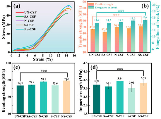 Different composite materials prepared from CSFs treated with various chemical processes exhibit distinct changes in their mechanical properties. It is crucial to analyze the performance of these composite materials for their diverse applications in real-life scenarios. Figure 5 presents a comprehensive comparison of the mechanical properties of these composites. Specifically, Figure 5a illustrates stress–strain curves obtained from tensile tests, Figure 5b compares the tensile strength and fracture elongation of each material, Figure 5c displays the flexural strength obtained from bending tests, and Figure 5d shows the impact strength comparison using a polymer V-notch.