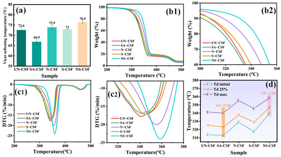 The Vicat softening points of composite materials composed of differently chemically treated CSFs were measured, and their thermal degradation behavior under a nitrogen atmosphere was analyzed using a thermogravimetric analyzer. Figure 8a presents a comparison of the Vicat softening points of the composite materials. The TG and DTG curves of the composite materials are shown in Figure 8(b1,b2,c1,c2), respectively, while Figure 8d depicts a comparative chart of the initial degradation temperature (Td initial), the temperature at 25% thermal degradation (Td 25%), and the temperature of the maximum degradation rate (Td max) for each composite material.