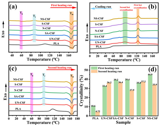 where and represent the respective enthalpies of melting and crystallization for the specimens. where and , respectively, denote the enthalpy change upon complete crystallization of PLA and PP, measured as 93.6 J/g and 188.9 J/g.