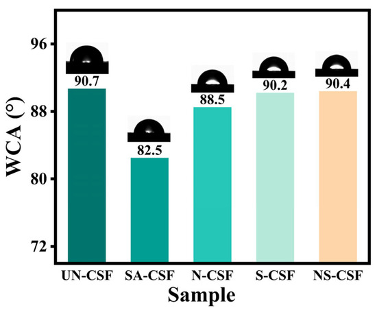 The wettability of all composite materials was analyzed using a water contact angle tester. The comparison of water contact angles for the composite materials is shown in Figure 10. The water contact angle of untreated cotton stalk fiber composite material (UN-CSF) was measured to be 90.7°. For all chemically treated cotton stalk fiber composite materials, the water contact angles decreased. Among them, the composite material treated with stearic acid showed the largest decrease in contact angle. This is primarily due to the uniform distribution of stearic acid-coated CSFs in the PLA matrix, resulting in a smoother and more uniform surface of the composite material. Consequently, this increased the contact area of water on the surface, leading to a decrease in the water contact angle. Although alkali treatment may increase the roughness of the composite material surface, it also increases the hydroxyl (-OH) content on the surface of CSFs. This formation of more hydrogen bonding contact points enhances the surface activity of the composite material, making it easier for water molecules to interact with the surface, thereby reducing the contact angle [61]. Silane-treated CSFs, despite their surface coating of silane, which facilitates uniform dispersion of the fibers in the polymer matrix, exhibit increased hydrophobicity due to the hydrophobic nature of the silane compound coating. This hydrophobic surface reduces the contact of water molecules with the surface, resulting in an increase in the water contact angle compared with SA-CSF [45]. Similarly, in alkali/silane-treated CSFs, the surface initially exposed numerous hydrophilic hydroxyl groups upon alkali treatment. However, the hydrophobic silane coating masks this advantage, leading to increased water contact.