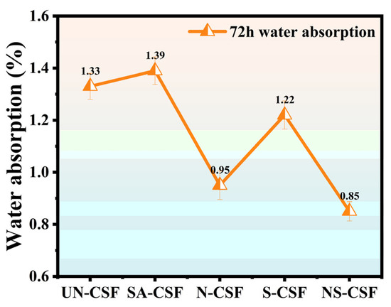The moisture absorption of the composite material was evaluated by conducting water absorption tests. A comparison of the moisture absorption of the composite materials is shown in Figure 11. In comparison, it can be observed that the SA-CSF component demonstrates superior moisture absorption characteristics. This is attributable to the presence of stearic acid, which forms a coating on the surface of cotton stalk fibers. Stearic acid, being a long-chain fatty acid, contains hydrophilic groups such as carboxyl groups in its molecular structure. These hydrophilic groups facilitate interactions with water molecules and attract them into the polylactic acid structure. Moreover, treatment with stearic acid effectively eliminates impurities protruding from cotton stalk fiber surfaces, enhancing their smoothness and providing an efficient pathway for water molecules to permeate into the material’s interior, thereby further augmenting its moisture absorption capability. Alkali treatment removes components such as pectin, hemicellulose, and lignin from the surface of the cotton stalk fibers, resulting in increased surface roughness and irregular and porous features, which hinder the entry of water molecules into the material, thus weakening its moisture absorption capability. While silane treatment results in a cleaner surface of the cotton stalk fibers, the hydrophobic nature of the silane layer on the surface impedes the infiltration of water molecules, resulting in a decrease in the moisture absorption performance of the S-CSF component. The NS-CSF component has the worst moisture absorption performance among all composite materials. This is because the cotton stalk fibers in this component undergo alkali treatment, which removes pectin, hemicellulose, lignin, and other components from the fiber surface. As a result, the roughness of the fiber surface increases and disrupts the channels for water molecules to penetrate. Furthermore, silane treatment is applied to cover a hydrophobic silicon oxide coating on the surface of these fibers, further repelling water molecule infiltration and reducing their moisture absorption performance even more. The NS-CSF component exhibits the poorest moisture absorption performance among all composite materials due to the alkali treatment of cotton stalk fibers, which eliminates pectin, hemicellulose, lignin, and other components from the fiber surface. Consequently, the increased roughness of the fiber surface disrupts water molecule penetration channels. Additionally, a silane treatment is applied to create a hydrophobic silicon oxide coating on these fibers’ surfaces, further deterring water infiltration and reducing their moisture absorption performance. The conclusion can be drawn that the enhancement of cotton stalk fiber surface polarity and improvement in overall fiber integrity and smoothness can significantly augment the moisture absorption performance of composite materials.