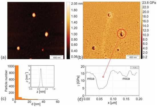 Reference value of Young’s modulus of elasticity of mica Emica is in the range 140 to 210 GPa [38]. The Young’s modulus was from 2 to 7 GPa lower than Emica for dots with diameters up to 5 nm, whereas for dots with higher diameters (more than 13 nm), Young’s modulus was from 10 to 12.5 GPa lower than Emica (Figure 1c,d). This result indicates that larger PHL-CQDs nanoparticles are considerably softer than smaller. Under small nanoparticles, we considered particles with diameters up to 5 nm. Under big nanoparticles, we considered particles with diameters higher than 5 nm.