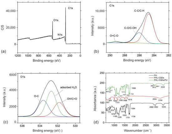 (a) XPS survey spectrum of PHL-CQDs nanoparticles; (b) High-resolution XPS spectrum of C1s peak of PHL-CQDs nanoparticles; (c) High-resolution XPS spectrum of O1s peak of PHL-CQDs nanoparticles; Black curve presents envelope spectra of C1s and O1s peaks; (d) FTIR spectra of neat PU (black curve), PHL-CQDs nanoparticles (red curve), and PHL-CQDs/PU composite films (green curve).