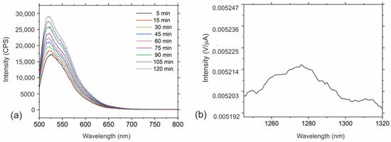 Different types of carbon dots are well known as a good photosensitizer material [11,48]. It means that they generate reactive oxygen species (ROS) under visible light illumination. There are two possible mechanisms of ROS production: one involves energy transfer from photoactive material to molecular oxygen, and the other undertakes the electron transfer from photoactive material to molecular oxygen [49,50]. Figure 7a,b show singlet oxygen production measured by two methods: measurement of PL spectra of SOSG at 530 nm (Figure 7a) and direct measurement of luminescence of singlet oxygen at 1270 nm (Figure 7b). From Figure 7a we can observe that the intensity of PL peak increases with time (5–120 min). Figure 7b shows a small broad luminescence peak at 1270 nm which could be assigned to the production of singlet oxygen.