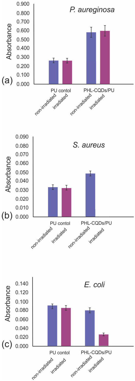 Apart from testing of antibacterial activity against eight bacteria strains, we conducted investigation on antibiofouling activity of PHL-CQDs/PU composite films toward three bacteria biofilms. Bacteria biofilms exist in the form of clusters attached to a certain surface or embedded each other in polymer matrix. These matrices consist of proteins, polysaccharide, and eDNA and may be cause of many human diseases. Figure 8a–c present antibiofouling activities of PHL-CQDs/PU composite films against three bacteria biofilms: P. aeruginosa, S. aureus, and E. coli. Figure 8a shows that P. aeruginosa is not sensitive on PHL-CQDs/PU composite films, whereas PHL-CQDs/PU composite films eradicate S. aureus biofilm completely under blue light irradiation for 1 h (Figure 8b). E. coli biofilm was reduced by almost 75% after blue light irradiation for 1 h. P. aeruginosa is a Gram-negative bacterium. The main properties of this bacterium are its metabolic versatility and ability to colonize animal hosts, ecological niches, and water environments [52]. In human beings, a lot of serious diseases can be caused by P. aeruginosa. This bacterium exhibits high resistance to various antibiotics caused by low outer membrane permeability. S. aureus is an important pathogen because it can be found in many hospitals on different surfaces. It causes minor skin infection to serious tissue infection and sepsis. The action of S. aureus is based on the generation of surface proteins. These proteins cause the secretion of extracellular toxins and bacterial adherence to host tissues [53].