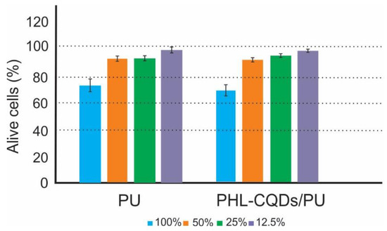 To study the cytotoxicity of PHL-CQDs/PU composite films, we used human keratinocytes cell lines (HaCaT). All experiments were conducted in dark conditions. HaCat cells are the common type of skin cells found in epidermis and they divide in the basal to spinous layer. They play the key role in the wound healing treatment. These cells form a barrier against environmental effects such as heat, UV radiation, water loss, and pathogen microbes (bacteria and viruses). In this way, it is of a great importance to investigate if the usage of PHL-CQDs/PU composite films as antibacterial surfaces (coatings) can damage these cells [56,57]. Figure 9 presents the cytotoxicity of neat PU (control sample) and PHL-CQDs/PU composite films. From this figure, we observe that the control sample did not show toxicity in any concentration of extract. PHL-CQDs/PU composite films did not show any toxicity at concentrations of 12.5, 25, and 50% either, but these samples showed mild cytotoxicity in concentration of 100% of extract.
