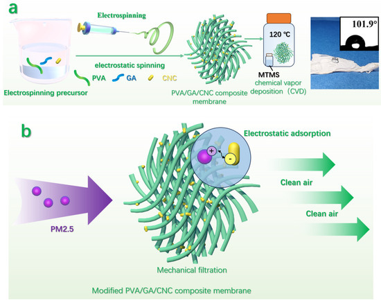 As shown in Figure 2, the PVA/GA/CNC composite membrane was obtained by electrospinning of liquid mixtures containing PVA, GA, and CNC. Then, the composite membrane was treated with a hot gas phase of MTMS to hydrophobize it.
