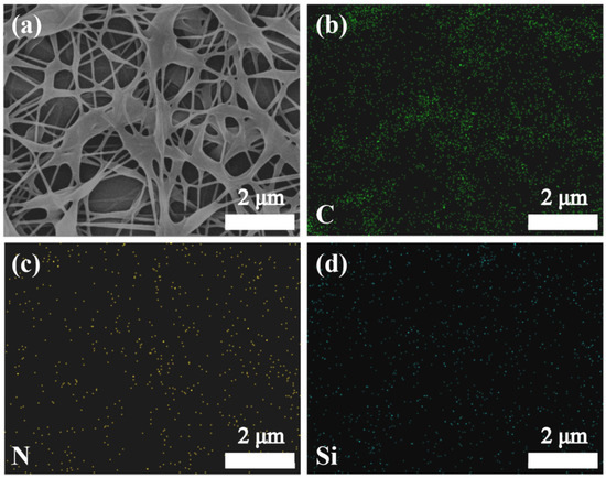 To show the deposition of MTMS, EDS analysis was performed on a modified PVA/GA/CNC composite membrane. As shown in Figure 4a–d, element N comes from GA, and GA and PVA are combined and evenly distributed in a modified PVA/GA/CNC composite membrane. Element Si comes from MTMS, and it can be observed that there is a uniform element Si on the surface of a modified PVA/GA/CNC composite membrane, which also indicates that MTMS is evenly deposited on the PVA/GA/CNC composite membrane.
