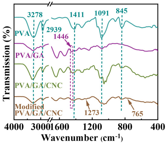 The chemical structures of different PVA-based membranes were analyzed by FTIR (Figure 5). The pure PVA electrospinning membrane exhibited -OH stretching vibration at 3278 cm−1, -C-O bending vibration at 1091 cm−1, -CH3 bending vibration at 1411 cm−1, and -CH2 symmetric stretching vibrations at 2939 and 845 cm−1 [34,35]. After the introduction of GA into the system, the PVA/GA electrospinning membrane exhibited a C-N vibration peak at 1446 cm−1, which was caused by the vibration stretching of the C-N chain segment in GA [36,37,38]. After the introduction of CNC into the system, the PVA/GA/CNC composite membrane did not show a new vibration peak because no new chemical bond was introduced into the system [39]. After the thermochemical vapor deposition of PVA/GA/CNC composite membrane with MTMS, the system exhibited Si-C and Si-O-Si asymmetric stretching of MTMS at 1273 cm−1 and 765 cm−1, indicating the successful composite of MTMS [40,41]. Above all, it can be seen that the internal of the modified PVA/GA/CNC composite membrane mainly depends on hydrogen bonds or physical connections.