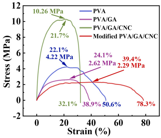 Tensile stress−strain curves of PVA, PVA/GA, PVA/GA/CNC, and modified PVA/GA/CNC composite membranes.