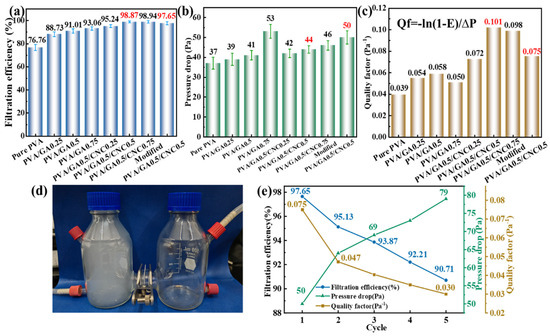 The PM2.5 filter device is shown in Figure 8d. Additionally, the hot gas deposition gives the system excellent hydrophobic ability, and the water contact angle reaches 101.9°. The modified PVA/GA/CNC composite membrane can remove surface adhering PM2.5 by washing to improve its filtration efficiency. As shown in Figure 8e, after five filtration–washing–re-filtration cycles, the modified PVA/GA/CNC composite membrane still has a high PM2.5 filtration efficiency (90.71%). The accumulation of PM2.5 in the modified PVA/GA/CNC composite membrane blocked the network structure in the membrane, resulting in an increased pressure drop (79 Pa). However, in general, modified PVA/GA/CNC composite membrane still maintains a high PM2.5 filtration effect after five washing cycles and could be used as an excellent air filtration device for personal protection, home or factory air purification, and other fields.