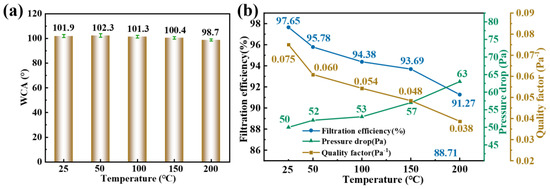 (a) WCA and (b) PM2.5 filtration performance of modified PVA/GA/CNC composite membrane at 25, 50, 100, and 150 °C, respectively.