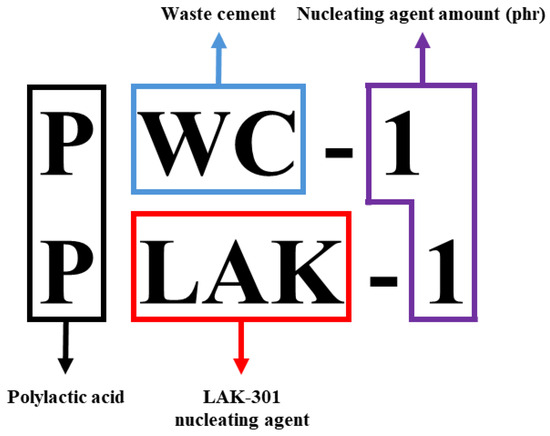 | Nomenclature | PLA (g 1) | Waste Cement (phr 2; g 1) | LAK−301 (phr 2; g 1) |