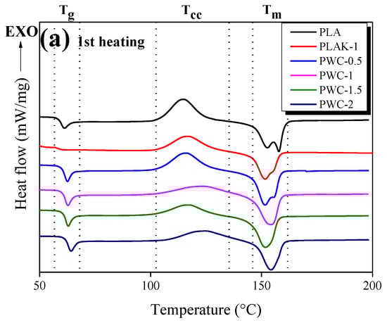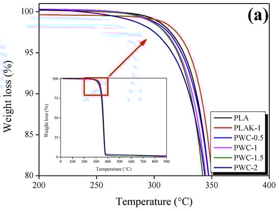 - Fehri, S.; Cinelli, P.; Coltelli, M.B.; Anguillesi, I.; Lazzeri, A. Thermal Properties of Plasticized Poly (Lactic Acid) (PLA) Containing Nucleating Agent. Int. J. Chem. Eng. 2016, 7, 85–88. [Google Scholar] [CrossRef]