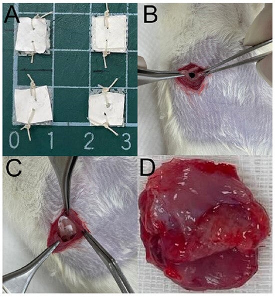 Sprague-Dawley rats (approximately 300 g) received treatment and care under the supervision of a licensed veterinarian, following the regulations of the National Institute of Health of Taiwan. The entire procedures involving animals acquired approval from the Institutional Animal Care and Use Committee of Chang Gung Memorial Hospital (IACUC: CGMH2018121905). The animals were initially anesthetized with isoflurane. Before implantation, nHA filled PCL meshes and drug-loaded PLGA nanofibers were integrated via sutures (Figure 2A). A 4 cm cut was made in the lower abdomen of each rat (Figure 2B). Following the implantation of resorbable nanofibrous scaffold (3 cm × 1 cm × 5 mm in dimension) (Figure 2C), the wound was sealed using 3-0 Vicryl sutures (Ethicon Inc., Bridgewater, NJ, USA).
