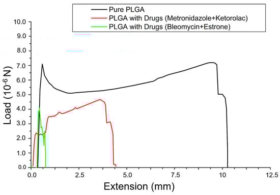 Stress–strain curves of virgin poly (lactic-co-glycolic acid) (PLGA) nanofibers and drug-loaded PLGA nanofibers.