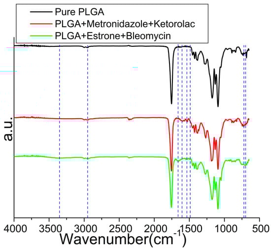 Fourier transform infrared spectroscopy (FTIR) spectra of metronidazole and ketorolac loaded PLGA nanofibers, and bleomycin and estrone embedded PLGA nanofibers.