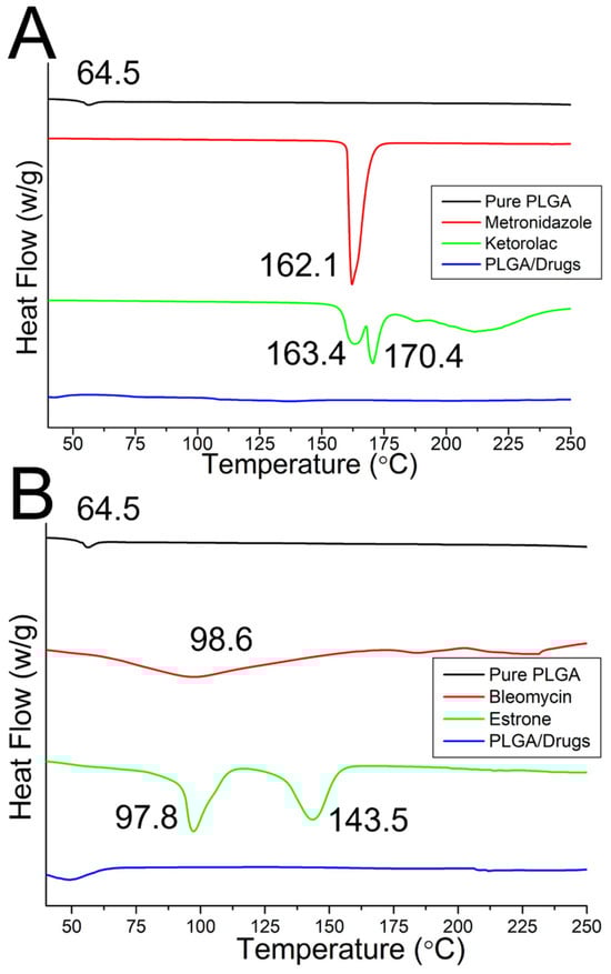 Figure 8A depicts the thermograms of virgin PLGA and metronidazole/ketorolac-embedded PLGA nanofibers. The exothermal peaks at 162.1 °C for metronidazole [39] and at 163.4 °C and 170.4 °C [40] for ketorolac diminished after mixing with PLGA. Further, Figure 8B shows the DSC curves for both virgin PLGA and bleomycin and estrone loaded PLGA nanofibers. Again, the exothermal peaks at 98.6 °C for bleomycin [41] and at 97.8 °C and 143.5 °C [42] for estrone could not be found after mixing with PLGA.