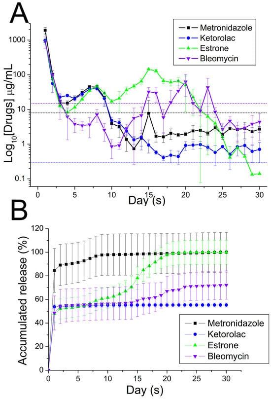 In vitro (A) daily, (B) cumulative release of pharmaceuticals from the nanofibers. The minimum inhibitory concentrations (MICs) of metronidazole, ketorolac, and bleomycin were 8, 0.03, and 15 μg/mL, respectively. Meanwhile, the minimum therapeutic concentration (MTC) of estrone was 1.36 pg/mL, which is too low to be shown in the upper figure.